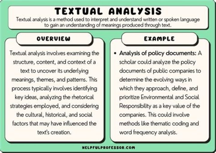 Textual analysis is a broad term for various research methods used to describe, interpret and understand texts. … It often aims to connect the text to a broader social, political, cultural, or artistic context.