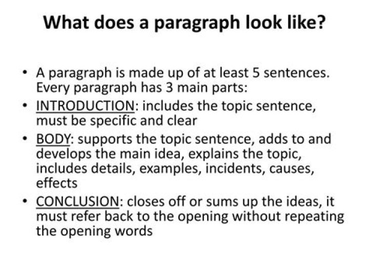 A paragraph should consist of six to seven sentences. … it should include a topic sentence, several supporting sentences, and possibly a concluding sentence.