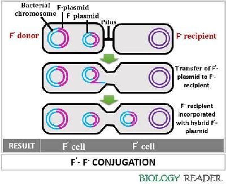 When an F+ donor gives an F plasmid to an F − recipient?When a F+ donor gives an F plasmid to a F- recipient.. Both strands become F+. The donor keeps one F+ strand and makes a 2nd complementary strand, thus remaining F+. The recipient receives one F+ strand and makes a 2nd complementary strand, thus becoming F+.