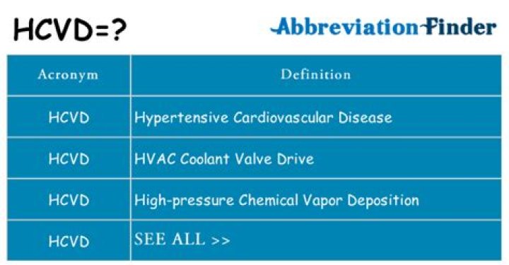 AcronymDefinitionHCVDHypertensive Cardiovascular DiseaseHCVDHVAC Coolant Valve DriveHCVDHigh-pressure Chemical Vapor Deposition (Silicon microchip manufacturing)