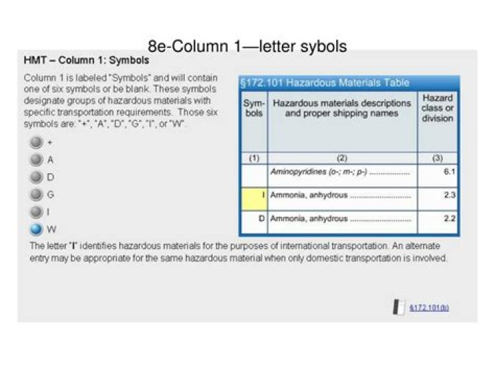 Columns 2, 3, 4, and 5 provide information used for the basic description of a hazardous material. Column 4 lists the identification number. Column 3 lists the hazard class or division. Column 2 lists the proper shipping name.What does the letter a mean in column 7?