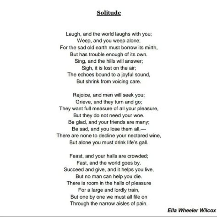 Her most popular poem, Ella Wheeler Wilcox’s “Solitude” is about the relationship between the individual and the outside world. … The context of the poem suggests that what follows is not a parade of moral platitudes but a series of choices. If you laugh, sing, rejoice, or feast, the world will be drawn to you.