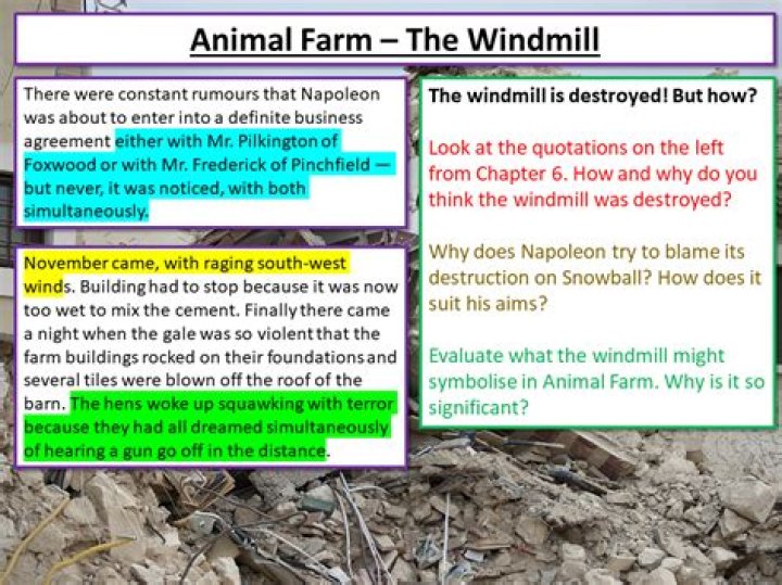 The windmill now symbolizes the gaslighting, or psychological manipulation, that the pigs have inflicted on the rest of the animals. The history of Napoleon’s rule has been denying the truth and telling the animals not to believe the evidence they’ve seen with their own eyes.