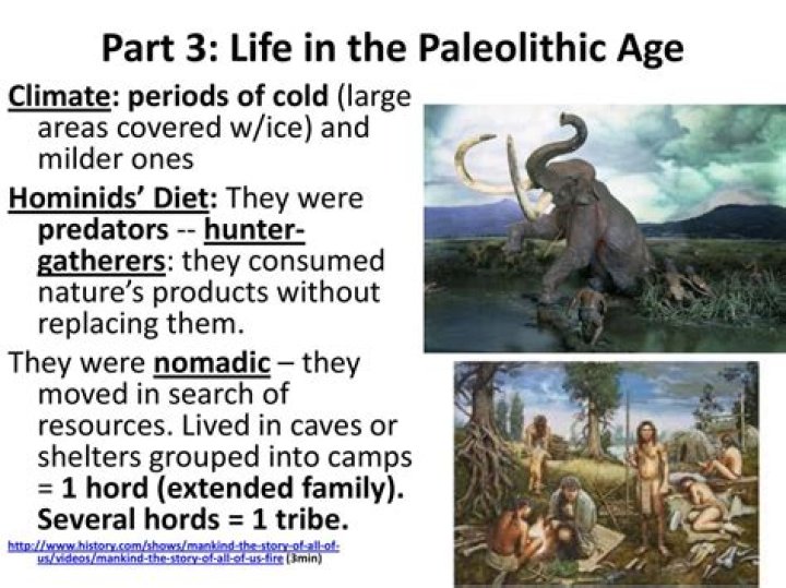 The Paleolithic Era (or Old Stone Age) is a period of prehistory from about 2.6 million years ago to around 10000 years ago. The Neolithic Era (or New Stone Age) began around 10,000 BC and ended between 4500 and 2000 BC in various parts of the world. Paleolithic humans lived a nomadic lifestyle in small groups.