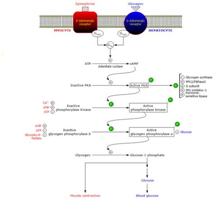 Glycogenolysis is regulated hormonally in response to blood sugar levels by glucagon and insulin, and stimulated by epinephrine during the fight-or-flight response. Insulin potently inhibits glycogenolysis. In myocytes, glycogen degradation may also be stimulated by neural signals.