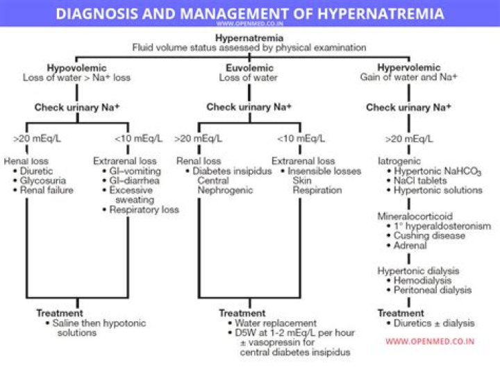 Two common causes of hypernatremia are insufficient fluid intake and too much water loss. In rare cases, consuming too much sodium can cause hypernatremia to occur. The opposite of hypernatremia is hyponatremia. This condition occurs when a person’s serum sodium level is less than 135 mEq/l.