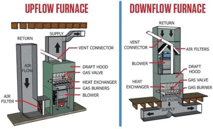 These terms refer to the direction the air flows as it is taken in and heated by the furnace. So in an upflow furnace, the cool air is taken in at the bottom, warmed, and then expelled at the top. A downflow furnace, on the other hand, takes in cool air at the top and expels heated air at the bottom.