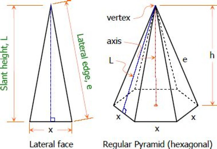 A pyramid is a solid with one base and lateral faces that meet at a common vertex. The edges between the lateral faces are lateral edges. The edges between the base and the lateral faces are base edges.