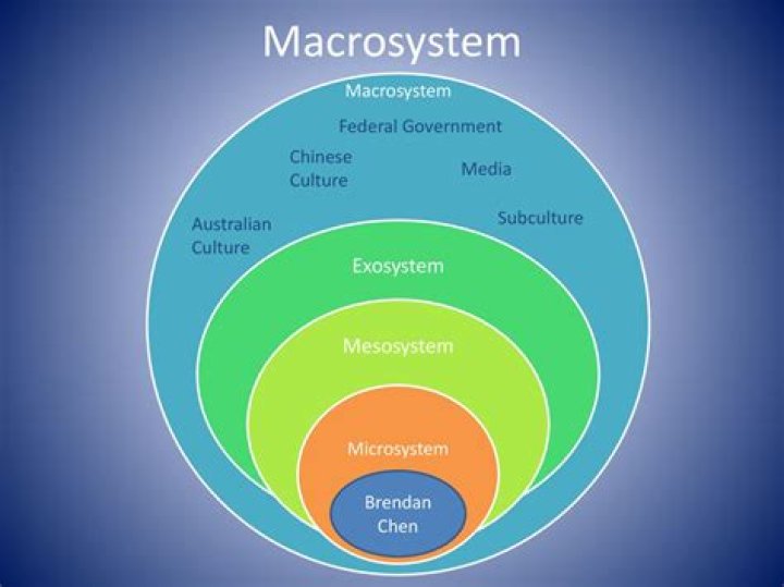 The mesosystem consists of interactions between a person’s microsystems. The exosystem affects a person indirectly, without their direct involvement. The macrosystem includes all other systems and the societal culture surrounding a person.What is an example of the Macrosystem?