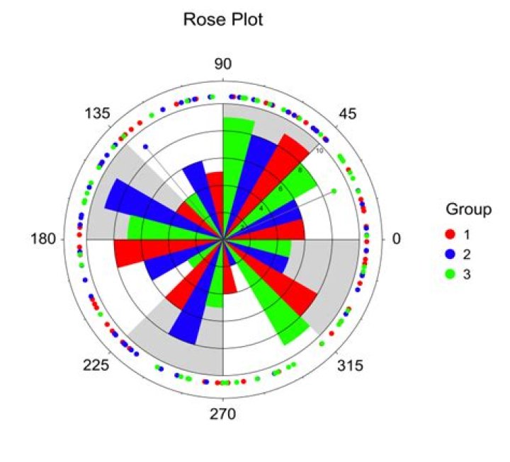 The rose plot is a variation of the common pie chart. … Pie charts and rose plots both use the area of segments of a circle to convey amounts. The pie chart uses a common radius and varies the central angle according to the data. That is, the angle is proportional to the frequency.