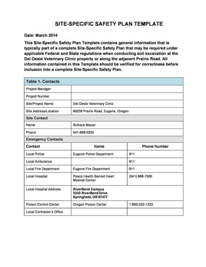 A Site Specific Safety Plan is a document that is written to outline how a general contractor will manage the risk on a specific project site and the health and safety requirements for that project. … The Site Specific Safety Plan should: Create a system that connects activities to hazards and hazard control.