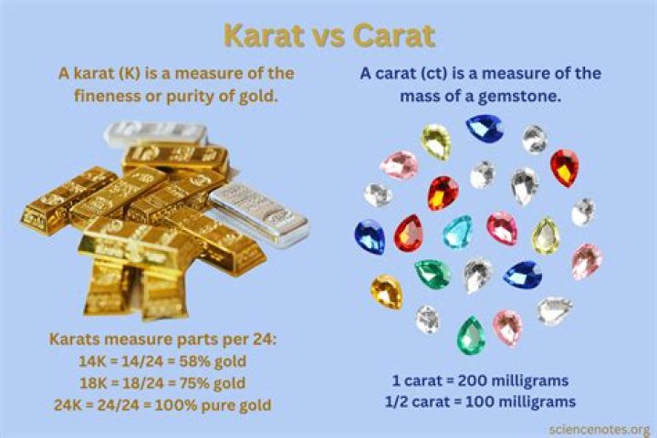 ‘Karat’ (vs. A carat is a unit of weight used to measure the size of a gemstone such as a diamond. … A karat is a measurement indicating the proportion of gold in an alloy out of 24 parts, so 18K gold is 18/24 parts gold.