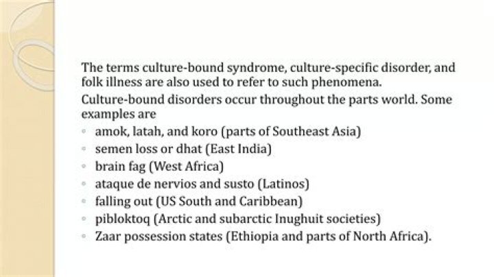 A culture-bound syndrome is a collection of signs and symptoms that is restricted to a limited number of cultures by reason of certain psychosocial features. Culture-bound syndromes are usually restricted to a specific setting, and they have a special relationship to that setting.