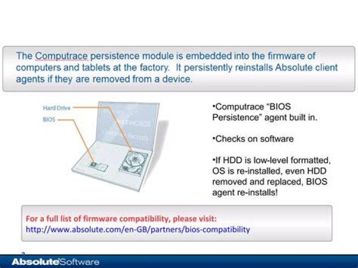 It is loaded in the partition gap of the hard drive upon service initiation. Computers that do not have the Persistence Module embedded into the BIOS during the manufacturing process can still undergo installation of the Application Agent and will perform with full Computrace functionality.
