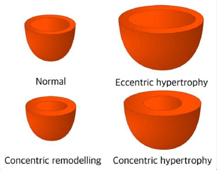 Concentric hypertrophy is associated with increased left ventricular wall thickness whereas eccentric hypertrophy is characterized by dilatation of the left ventricular chamber; however, there occurs a general increase in the overall size of cardiomyocytes under both conditions.