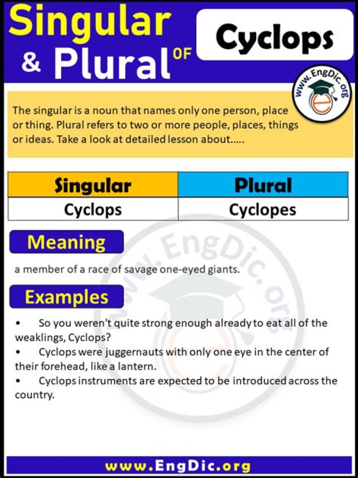 The proper noun “Cyclops,” for the one-eyed giant from Greek mythology, doesn’t form its plural in the usual way in American English. It’s “Cyclopes,” not “Cyclopses,” according to American dictionaries.Does Cy in Cyclops mean one?