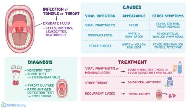Fever. White or yellow spots or coating on the throat and/or tonsils (tonsillar exudates) Red spots on the roof of the mouth (upper palette) Swollen or tender lymph nodes on the neck.