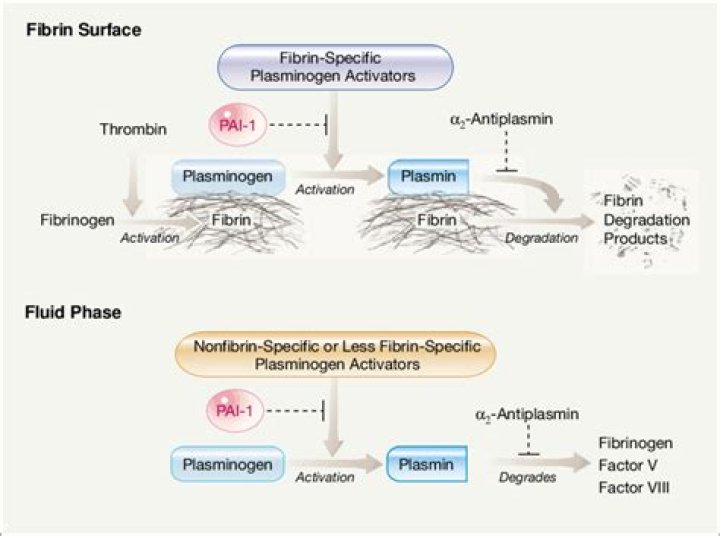 Fibrinolysis. The fibrinolytic system removes unwanted fibrin deposits to improve blood flow following thrombus formation, and to facilitate the healing process after injury and inflammation.