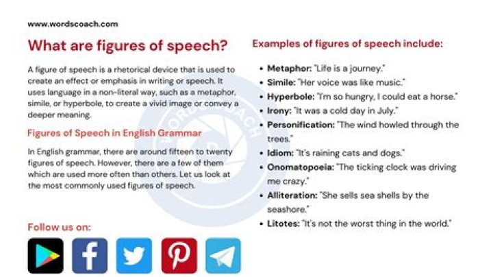 A figure of speech is a word or phrase using figurative language—language that has other meaning than its normal definition. … Figures of speech make up a huge portion of the English language, making it more creative, more expressive, and just more interesting!