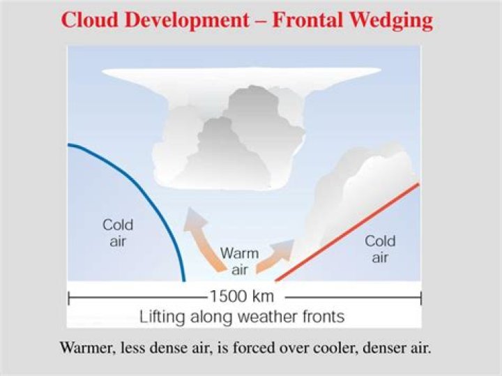 In frontal wedging, a cold mass of air acts as a barrier forcing warmer air to ramp up and rise.