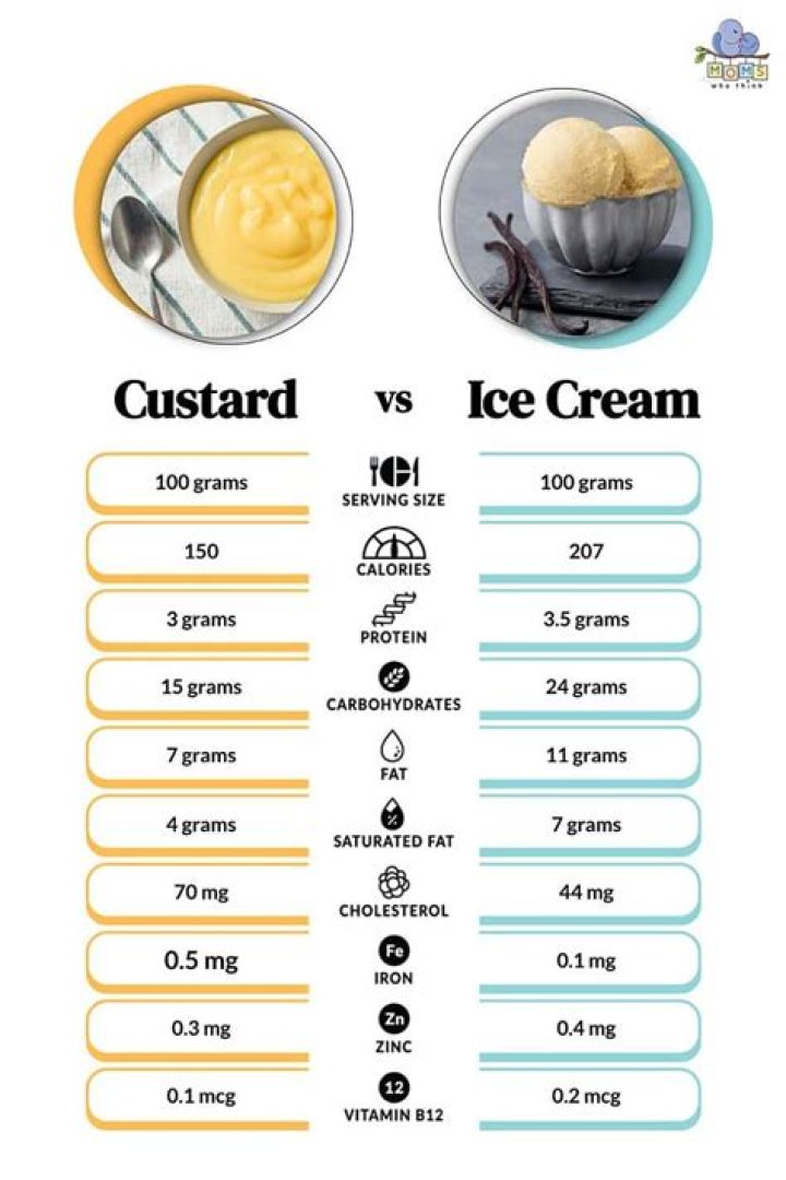 Brands vary, but vanilla ice-cream typically has about 10 per cent more calories than custard, as well as twice the saturated fat, less protein and half the calcium and potassium. However, ice-cream usually has less sugar and salt, too.