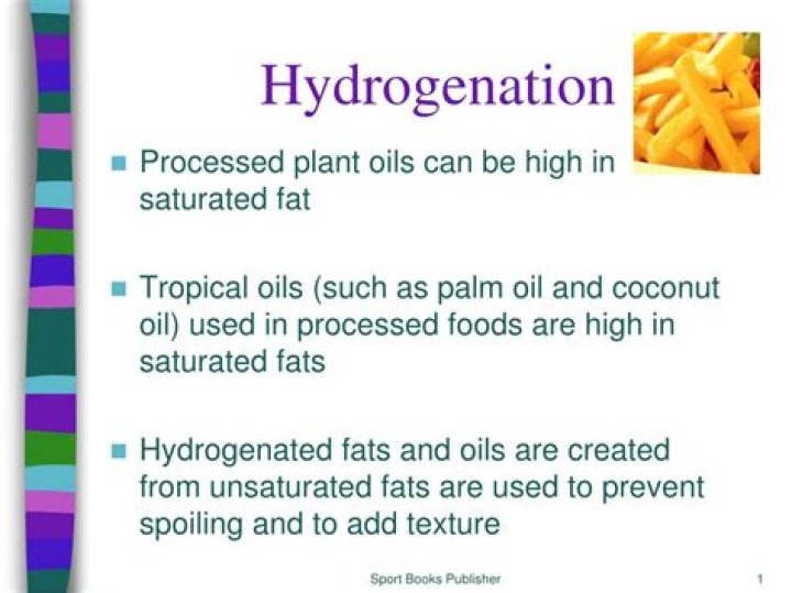 Hydrogenation is a process in which a liquid unsaturated fat is turned into a solid fat by adding hydrogen. During this manufactured partially hydrogenated processing, a type of fat called trans fat is made.