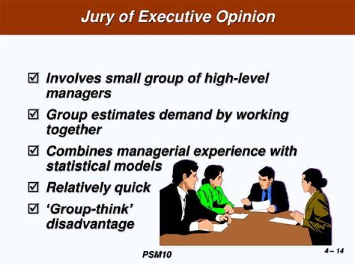 Executive opinion is exactly what the name implies: the best-guess estimates of a company’s executives. Each executive submits an estimate of the company’s sales, which are then averaged to form the overall sales forecast.What is jury Executive opinion?