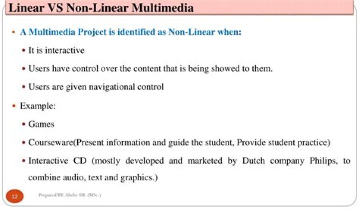 Non-linear multi-media information is not presented in sequential or chronological manner. Non linear multimedia programs are usually interactive and require user interaction. Example of Non Linear Multimedia are: #Gaming, #WebSites, #Hypermedia etc.