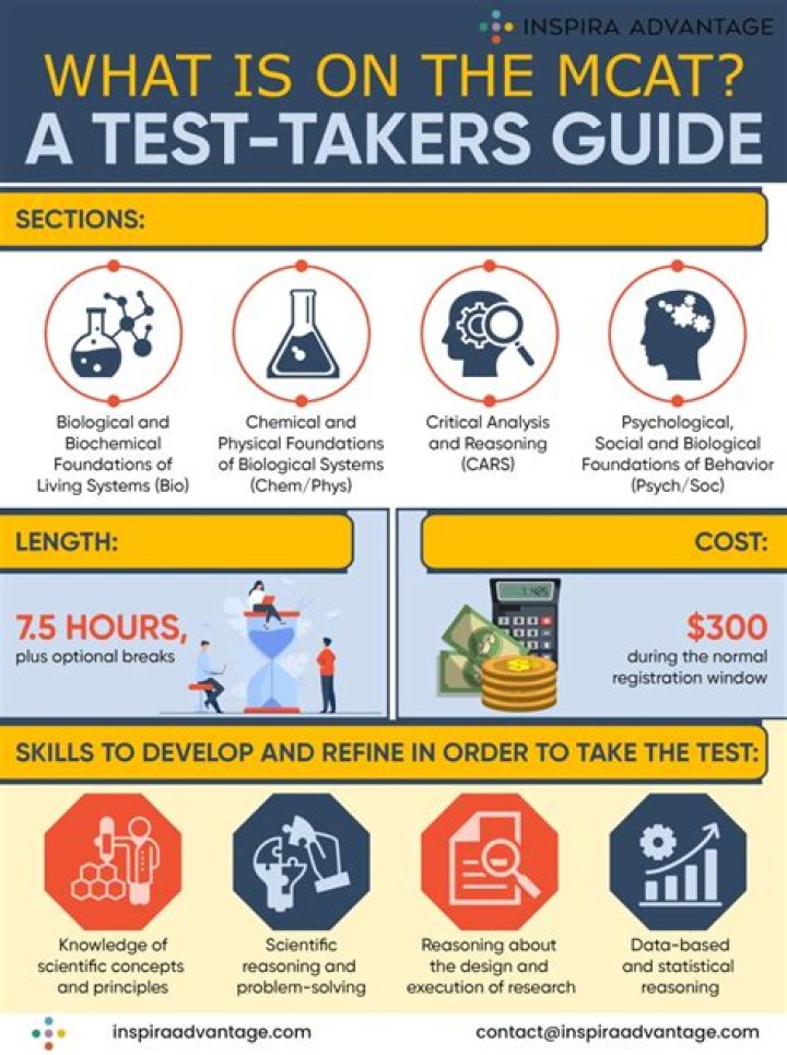 The MCAT is a 7.5-hour exam that consists of four sections: Biological and Biochemical Foundations of Living Systems; Chemical and Physical Foundations of Biological Systems; Psychological, Social, and Biological Foundations of Behavior; and Critical Analysis and Reasoning Skills.