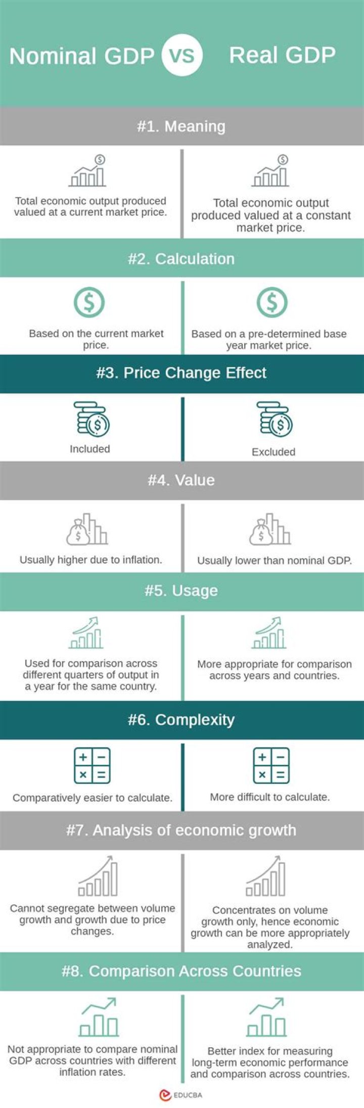While nominal GDP by definition reflects inflation, real GDP uses a GDP deflator to adjust for inflation, thus reflecting only changes in real output. Since inflation is generally a positive number, a country’s nominal GDP is generally higher than its real GDP.