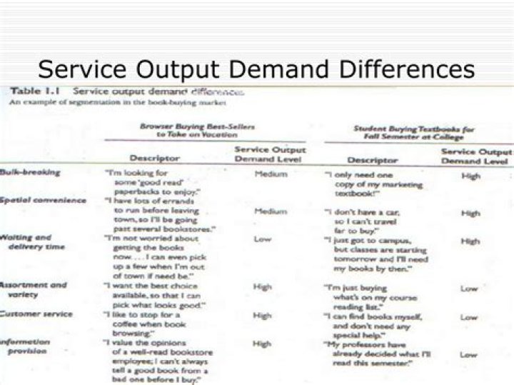 A channel delivers service output demands. Some of the examples of service output demands are: bulk breaking, spatial convenience, waiting time, delivery time, payment options such as credit, assortment/variety and customer service and information provision.