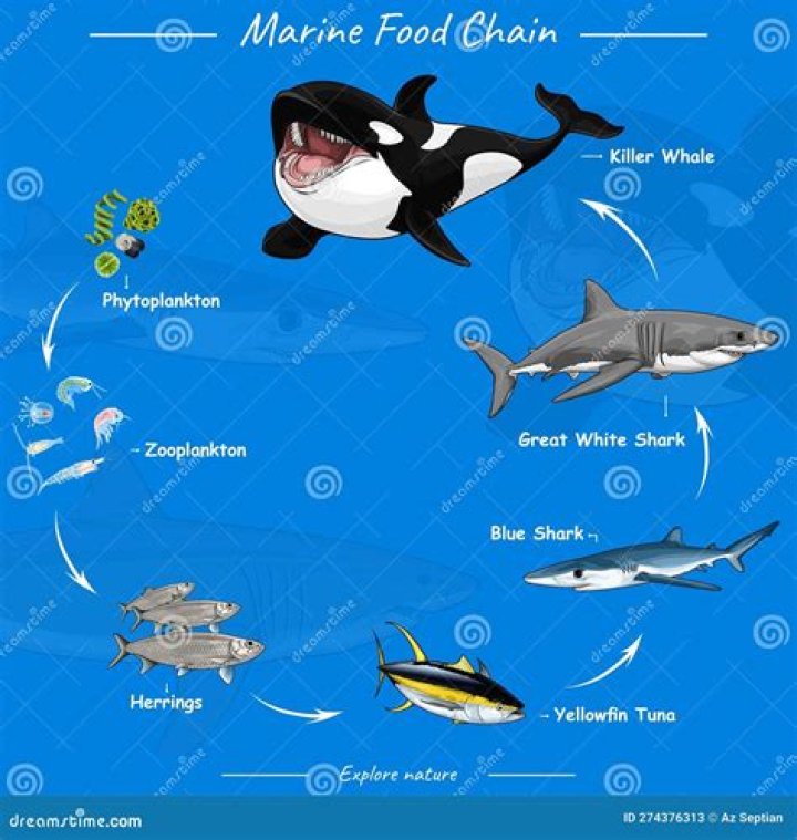 The orca, or killer whale is at the top of the marine food chain. … Orcas have 4-inch long teeth that they use to feast on other ocean animals, which can include seals, sea lions, sharks, seabirds, fish, and even whales.What are the 5 food chains?