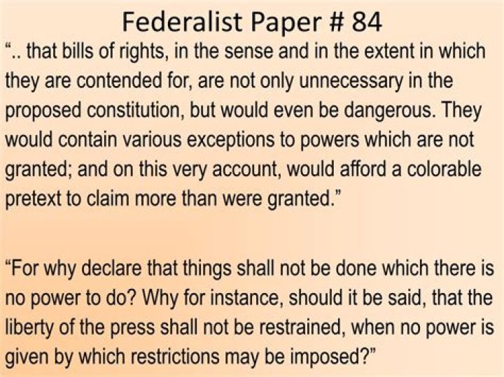 In Federalist 84, Alexander Hamilton answers the objection that the proposed Constitution did not include a Bill of Rights. … As such, the federal government did not possess the power to address basic individual rights, so there was no need for a federal bill of rights—indeed, one might be dangerous.