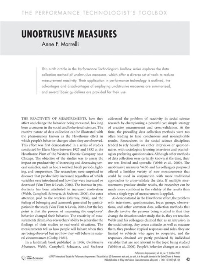 In research, an unobtrusive measure is a method of making observations without the knowledge of those being observed. Unobtrusive measures are designed to minimize a major problem in social research, which is how a subject’s awareness of the research project affects behavior and distorts research results.