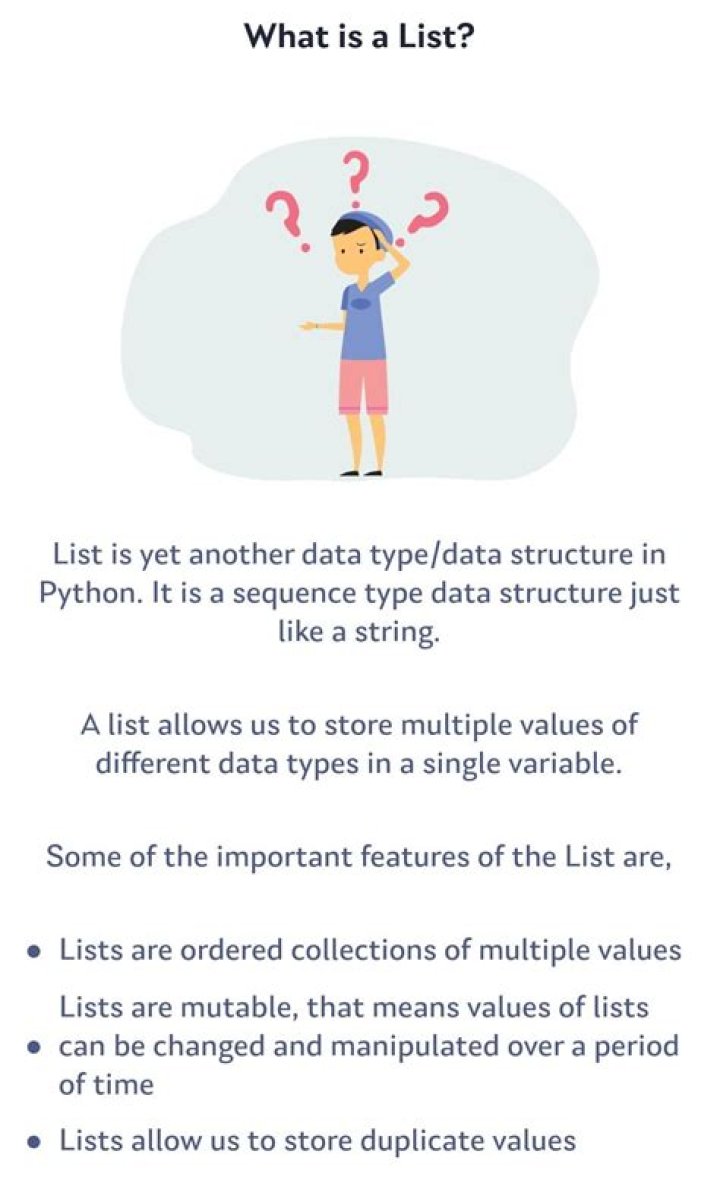 What is a List? A list is an ordered data structure with elements separated by a comma and enclosed within square brackets. For example, list1 and list2 shown below contains a single type of data. Here, list1 has integers while list2 has strings. Lists can also store mixed data types as shown in the list3 here.