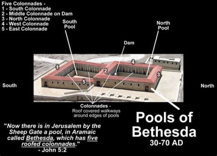 The Hebrew word Beth hesda means “house of mercy” or “house of grace.” In Hebrew and Aramaic it could also mean “shame” or “disgrace.” The Gospel of John describes the pools as having five porticoes. The pool has an extreme depth of 13 meters.