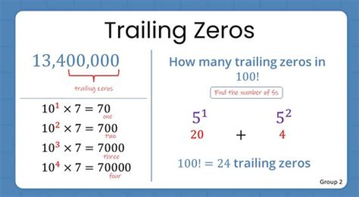 A trailing zero is a zero digit in the representation of a number which has no non-zero digits that are less significant than the zero digit. Put more simply, it is a zero digit with no non-zero digits to the right of it. … Trailing zeros are often discussed in terms of the base-ten representation of factorials.