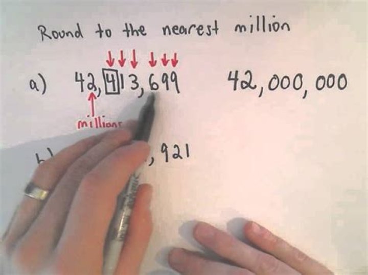 The nearest million could be 4,000,000 or 5,000,000 . To round to the nearest million, look at the digit in the column to the right, the hundred thousands. The number in the hundred thousands column is 5 . The rule is, if the number is 5 or more, round up.