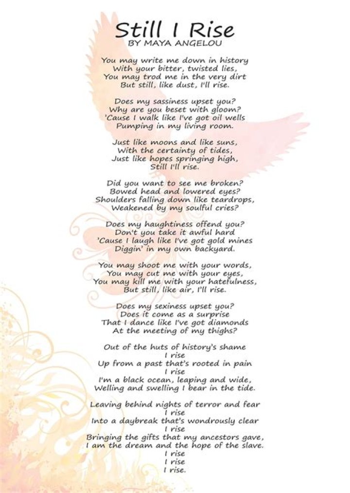 Does my sexiness upset you? Does it come as a surprise That I dance like I’ve got diamonds At the meeting of my thighs? Out of the huts of history’s shame I rise Up from a past that’s rooted in pain I rise I’m a black ocean, leaping and wide, Welling and swelling I bear in the tide.