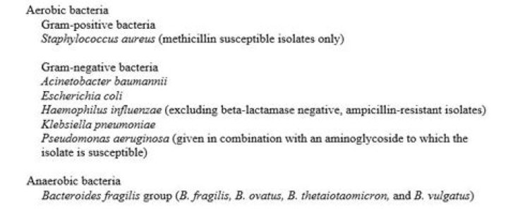 Aerobic and facultative gram-positive microorganisms: Staphylococcus aureus. Aerobic and facultative gram-negative microorganisms: Acinetobacter baumannii, Escherichia coli, Haemophilus influenzae, Klebsiella pneumoniae, and Pseudomonas aeruginosa.