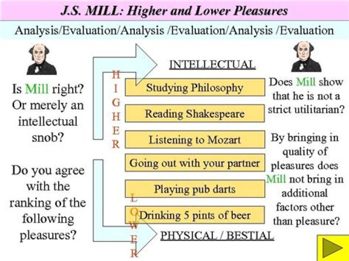 Mill distinguished between higher pleasures (those that require mental faculties that only educated humans could obtain) and lower pleasures (bodily pleasures that both animals and humans could experience). For Mill, higher pleasures are more valuable than lower pleasures, because of their “intrinsic superiority”.