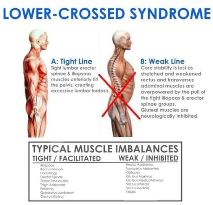 The imbalance of muscles that occurs in lower crossed syndrome results in anterior tilt of the pelvis, increased hip flexion and a compensatory hyperlordosis in the lumbar spine. This imbalance tends to over-stress both hip joints and leads to complaints such as lower back pain and sacroiliac joint dysfunction.