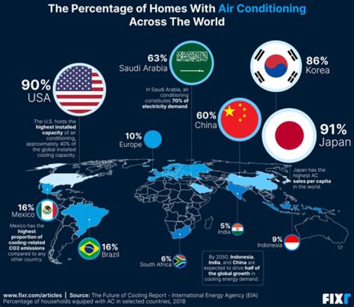 Today, less than a third of global households own an air conditioner. In countries such as the United States and Japan, more than 90% of households have air conditioning, compared to just 8% of the 2.8 billion people living in the hottest parts of the world.
