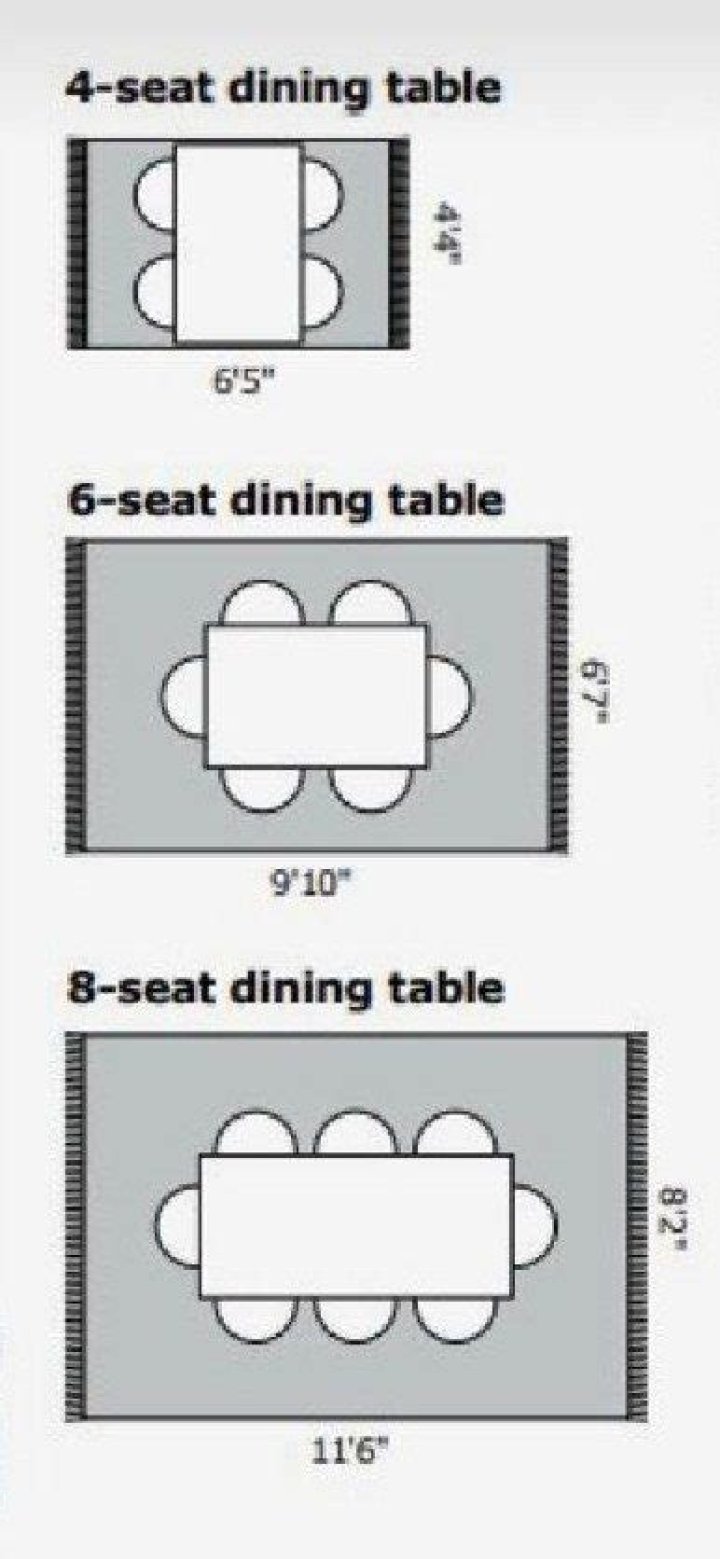 Rug Size for Dining Table With 6 chairs. A dining table for 6 would measure a minimum of 5’x3′ and would fit best on an 8’x10′ rug. This leaves you 30 inches on all sides for the dining chairs to be moved easily while staying on the rug.