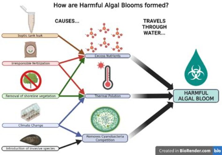 Some algal blooms are the result of an excess of nutrients (particularly phosphorus and nitrogen) into waters and higher concentrations of these nutrients in water cause increased growth of algae and green plants. As more algae and plants grow, others die.