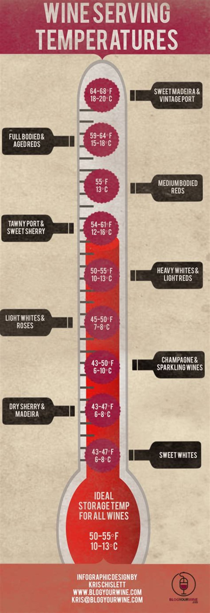 There is no optimal temperature for red wine, for example. Individual degrees won’t ruin your bottle, but generally the range of 45° F to 65° F provides the safest net for taste optimization.