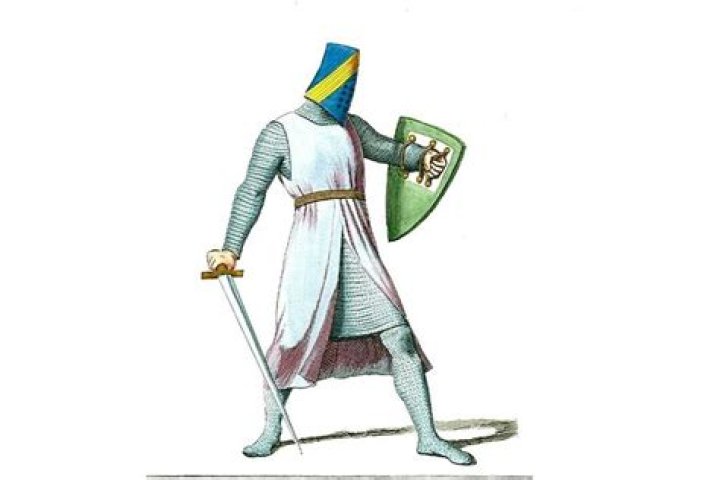 1033–1109) listed the equipment of a knight: his war horse (which by the thirteenth century was protected by mail and fabric), bridle, saddle, spurs, hauberk (a long-sleeved mail shirt, sometimes with a hood, or coif), helmet, shield, lance, and sword.