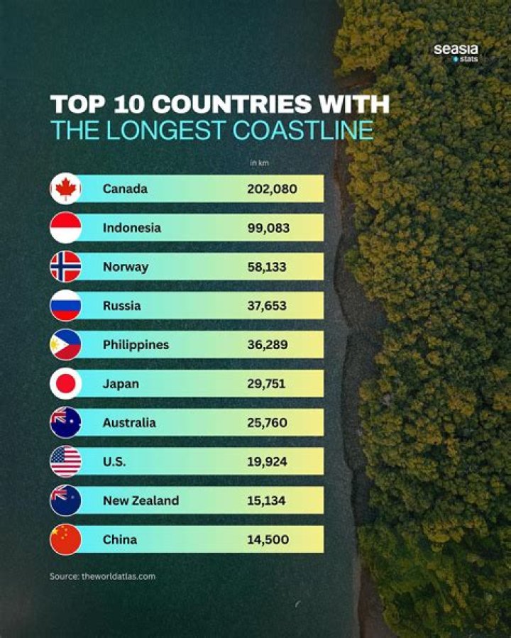 Name of CountriesDescription1. CanadaCoastline (Kilometres): 202,080 Coastline (Miles): 125,5672. NorwayCoastline (Kilometres): 58,133 Coastline (Miles): 36,1223. IndonesiaCoastline (Kilometres): 54,720 Coastline (Miles): 33,9394. RussiaCoastline (Kilometres): 37,653 Coastline (Miles): 23,396