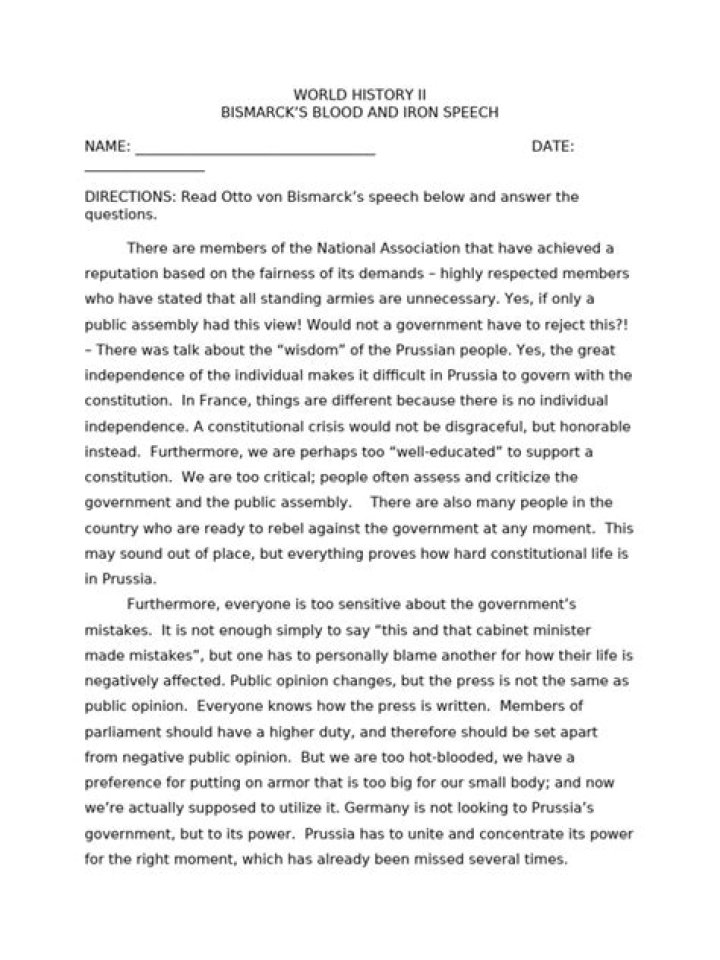 Bismarck said that “Prussia must collect and keep its strength for the right moment, which has been missed several times already; Prussia’s frontiers as laid down by the Vienna treaties are not conducive to a healthy national life; it is not by means of speeches and majority resolutions that the great issues of the day …