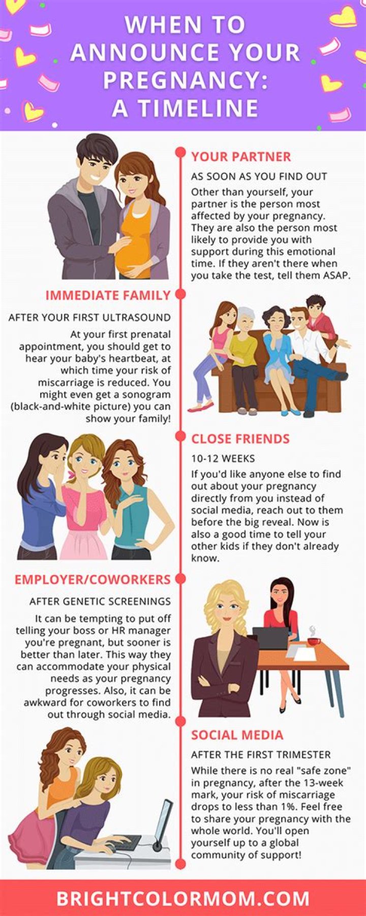 As we keep stressing, it’s entirely up to you. You can tell as soon as you know, or you can wait until week 9, 10, or 11 — or week 20, 30, or after you have your babe in arms.
